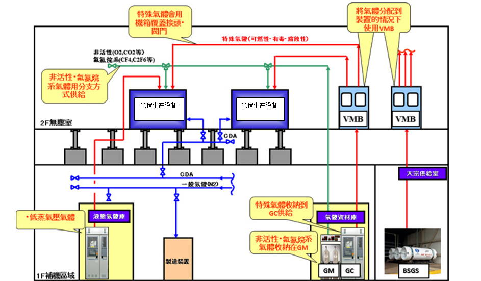特種氣體是光電子、微電子等領域,特別是超大規模集成電路、液晶顯示器件、非晶硅薄膜太陽能電池、半導體發光器件和半導體材料制造過程不可缺少的基礎性支撐源材料。它的純度和潔凈度直接影響到光電子、微電子元器件的質量、集成度、特定技術指標和成品率,并從根本上制約著電路和器件的精確性和準確性。沃飛科技提供太陽能光伏工廠所使用的高純度氣體(O2/Ar/N/H2/He等)、特氣(SiH4/GeH4/PH3/AsH3/SbH3/B2H6/BF3/NF3/PF3/PF5/CF5/CF4/C2H6/C3F8等)綜合供氣系統;排氣處理、監視系統的綜合管理系統;建立以安全為第一的特氣管理輸送系統。從設計、選型、制造、安裝、測試、調試和系統托管服務