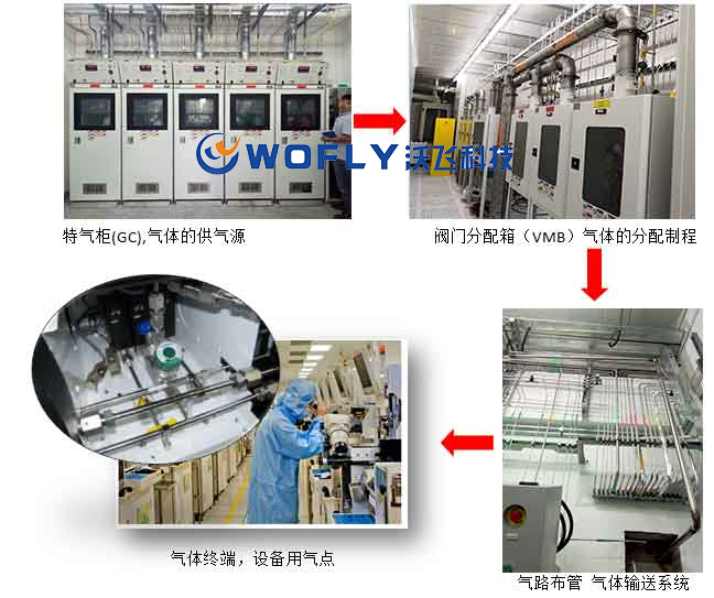 那么,沃飛科技如何推動電子特氣系統的安裝與應用呢。通常而言,特氣輸送系統是將特種氣體從氣源端、根據工藝設備的工藝需求、通過對流量和壓力等參數的控制,通過管道、無二次污染、穩定的輸送到工藝設備的用氣點,其基本流程是:氣源、控制柜、管道傳輸、VMB、用氣點。